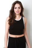 This crop top features a jersey knit fabriction with contrasting trims, round neckline, and sleeveless construction. Accessories sold separately. Made in U.S.A. 48% Rayon, 48% Polyester, 4% Spandex.