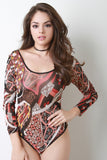 This bodysuit features semi-sheer mesh, abstract pattern, scoop neckline, long sleeves, and deep scoop back. Accessories sold separately. Made in U.S.A. 65% Polyester, 35% Rayon.