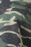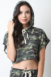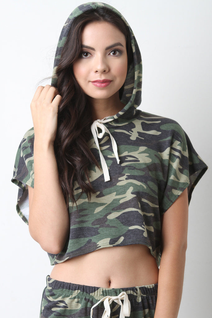 This crop top features soft knit, camouflage pattern, short sleeves, and hooded neckline with self-tie drawstring. Accessories sold separately. Made in U.S.A. 48% Rayon, 48% Polyester, 4% Spandex.