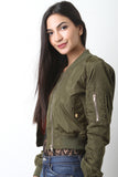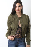 This bomber jacket features windbreaker fabric, contrast rib knit trim, zip-up front, left arm zipper accent, two snap button pockets, and crop construction. Finished with lining. Accessories sold separately. Self: 100% Polyester. Lining: 100% Polyester.