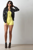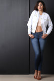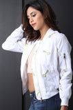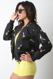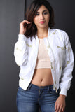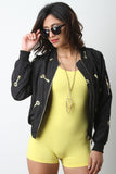 This bomber jacket features windbreaker fabric, rib knit trim, stitched key pattern, zip-up front, left arm zipper accent, and two pockets. Finished with lining. Accessories sold separately. 100% Polyester.