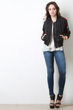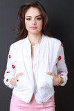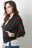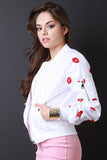 This bomber jacket features windbreaker fabric, rib knit trim, embroidered kisses, zip-up front, left arm zip accent, and two snap button pockets. Finished with lining. Accessories sold separately. 100% Polyester.