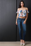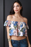This cute crop top features a lightweight woven fabrication, floral print pattern, off the shoulder neckline, ruffle detail, double layer, elastic trim for fit. Accessories sold separately. Made in U.S.A. 100% Polyester.