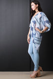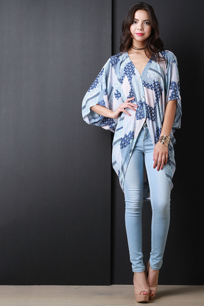 This top features a light weight woven fabrication, v neck line 3 button front closure. cocoon silhouette, raglan style sleeves and a over-sized fit. Accessories sold separately. Made in U.S.A. 100% Polyester.