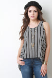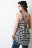 This sleeveless top features a round neckline, backless corset lace up design, contrasting stripes, and a high low hemline. Accessories sold separately. Made in U.S.A. 100% Polyester.