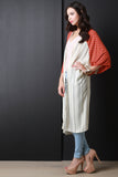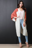 This kimono features a contrast yoke, v back, boxy silhouette, long sleeves, open front and a long hem line. Accessories sold separately. Made in U.S.A. 100% Polyester.