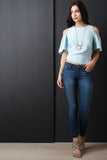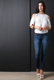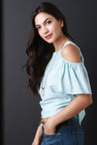 This cute crop top features, round neckline, a cold shoulder design, ruffle sleeves, open back, button closure at nape, tie back, and a woven fabrication. Accessories sold separately. 55% Cotton, 45% Rayon.