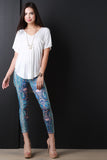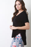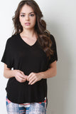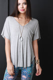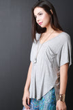 This knit top features a v-neckline, short sleeves, boxy relax fit, rounded high low hemline, and a left breast pocket. Accessories sold separately. 95% Rayon, 4% Spandex.