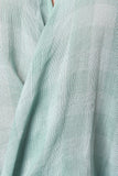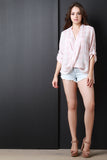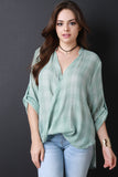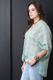 This breezy top features a deep v neck line, draped design, lightweight woven gauze fabrication, gingham print, half sleeves with button detail, finished with a high low hem.