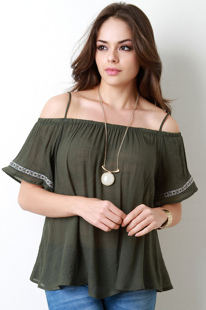 This casual top features a woven fabric, cold shoulder design, spaghetti straps, and off the shoulder short sleeves with embroidered pattern trim detail. Accessories sold separately. Made in U.S.A. 65% Rayon, 35% Polyester.