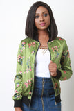 This stylish bomber jacket features glossy charmeuse fabric, floral print, rib knit trim, zip-up front, two pockets, and lining. Accessories sold separately. Self: 100% Polyester. Contrast: 95% Polyester, 5% Spandex. Lining: 100% Polyester.