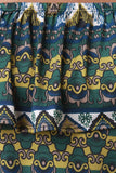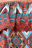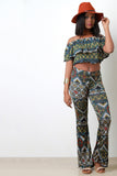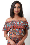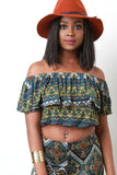 This lovely top features a soft stretchy knit fabrication, ethnic print pattern, elasticized off the shoulder ruffle layering neckline, and cropped hemline. Accessories sold separately. Made in U.S.A. 92% Polyester, 8% Spandex.