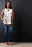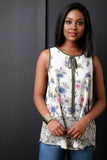 This cutesy top features a soft flowy knit fabrication with simple floral print pattern, round neckline with self-tie drawstring detail, and sleeveless fit. Finished with a rounded hemline and button hook closure at nape. Accessories sold separately. Made in U.S.A. 100% Polyester.