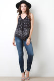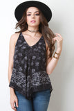 This sleeveless top features a v-neckline, racerback, shift cut fit, asymmetrical high low hemline, and boho print on semi-sheer chiffon fabrication. Accessories sold separately. Made in U.S.A. 100% Polyester.