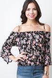 This lovely top features a stretchy jersey knit, floral prints throughout, elasticized neckline, and cold shoulder design with fixed thin straps. Finished with an elasticized hem and slightly cropped fit. Accessories sold separately. Made in U.S.A. 95% Rayon, 5% Spandex.