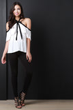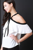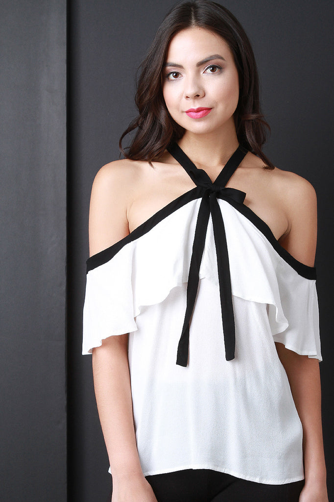 This pretty blouse top features a contrasting halter neckline with bow detail at front, cold shoulder cutout design, flutter ruffle sleeves, and relaxed fit. Accessories sold separately. 100% Rayon.