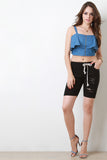 This crop top features chambray fabric, u-neckline, zip-up front, and tiered construction. Accessories sold separately. Made in USA. 100% Cotton.