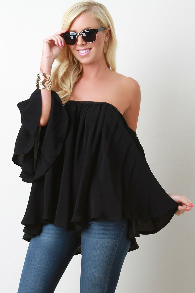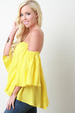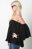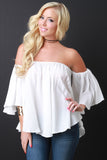 This bardot top features an elasticized off-the-shoulder neckline, quarter-length sleeves, and flounce cut fit. Accessories sold separately. Made in U.S.A. 100% Polyester.