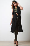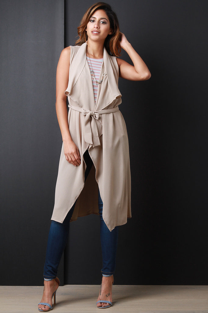 This vest features lightweight semi-sheer fabric, oversized lapels, self-tie belt, and longline construction. Accessories sold separately. Made in USA. 97% Polyester, 3% Spandex.