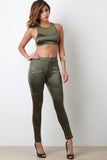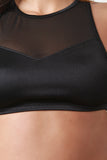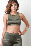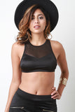This stretch knit crop top features a sheer design along the neckline and back. Scooped neckline and racerback silhouette. Full zipper back closure. Accessories sold separately. 85% Polyester. 15% Elastane.