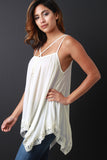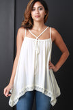 This relaxed cut top is sleeveless design, featuring spaghetti straps and two front crossing straps. Square neckline with a keyhole. Unlined. Sharkbite hemline with a crochet trim. Accessories sold separately. 100% Rayon.