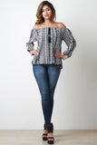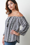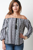This top has an off the shoulder neckline with an elastic band, featuring a decor fringe tassels bow tie. Designed with three fourths quarter sleeves, featuring elastic ends. Lightweight. Unlined. Aztec print throughout. Finished with a crochet trim hemline. Accessories sold separately. 100% Polyester.