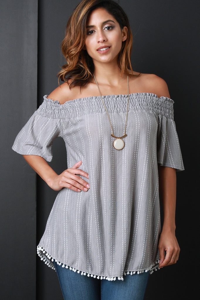 This top is off the shoulder neckline design with an elasticized structure. It is lightweight, quarter sleeves, and loose boxy cut silhouette. Textured stitching details. Finished with a pom pom trim hemline. Accessories sold separately. 69% Polyester. 31% Rayon.