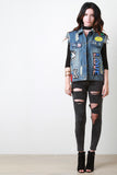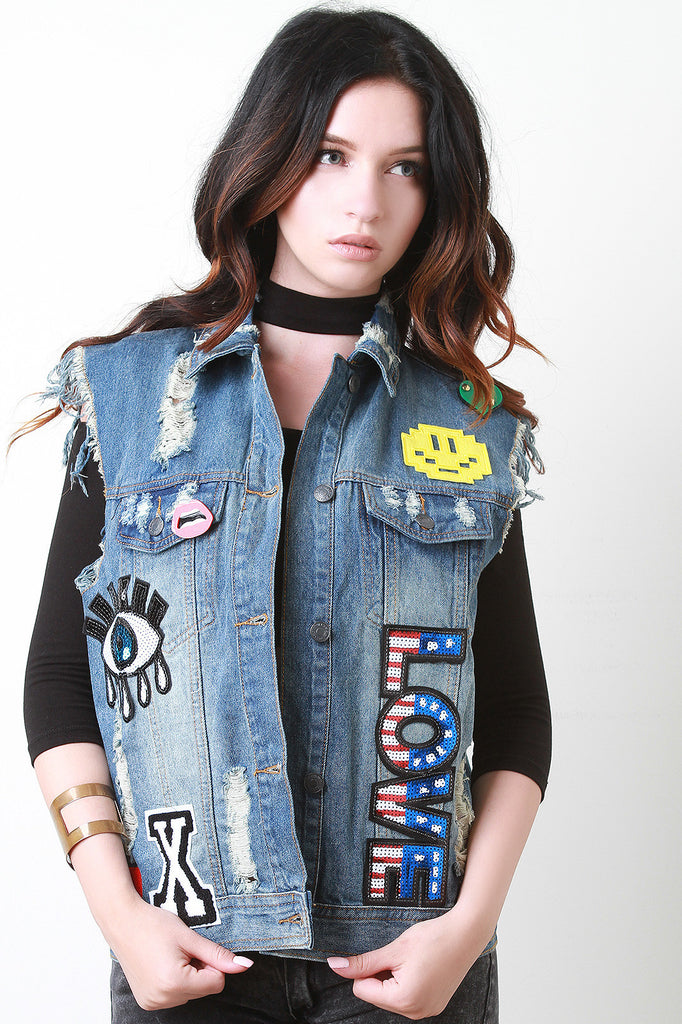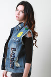 This vest features a collar neckline, button-up front, distress fray fringes, flap breast pockets, finished with sequence patches and buttons-pins. Accessories sold separately. 100% Cotton.