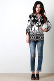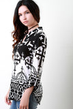 This eye-catching top features a soft stretchy knit fabrication, crosses and multipattern print design, half-placket neckline, and button-tabbed longsleeves. Finished with a rounded hemline. Accessories sold separately. Made in U.S.A. 95% Polyester, 5% Spandex.