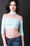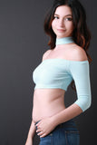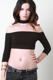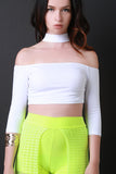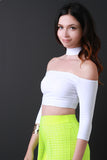 This crop top features a floating mock neck collar, off the shoulder design, half sleeves, a cropped hem and an exposed metal zipper closure. Accessories sold separately. Made in U.S.A. 95% Cotton 5% Spandex.