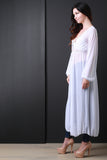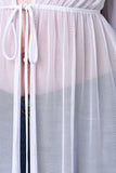 This maxi cover up features semi-sheer mesh, self-tie front, and long bishop sleeves. Accessories sold separately. Made in USA. 100% Polyester.