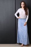 This  skirt  features acid wash fabric, elasticized crochet waistband, relaxed fit, and maxi length. Accessories sold separately. Made in U.S.A. 100% Rayon.
