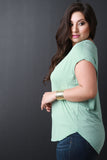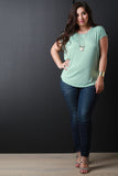 This plus size top features a jersey knit fabrication, round neckline, cap sleeves design, and curved hemline. Accessories sold separately. Made in U.S.A. 95% Rayon, 5% Spandex.