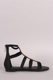 This edgy sandal features an elasticized straps design, center metallic ornament embellishment, lightly padded insole, and rear zipper closure for easy on/off.