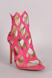 This eye-catching heel features a fire-shaped cage design vamp, open toe silhouette, and wrapped stiletto heel. Finished with lightly padded insole and convenient back zip-closure.