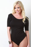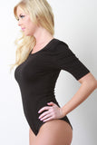 This bodysuit features a boat neckline, short sleeve construction, and a scooped back. Finished with a double snap button closure at crotch. Accessories sold separately. Made in U.S.A. 95% Cotton, 5% Lycra.