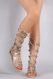 This gladiator silhouette, featuring a strappy shaft and lace up design. Rear back adjustable zipper. Finished with a metallic chain outsole.
