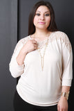 This plus size top features a semi-sheer floral lace yoke, round neckline, quarter-length dolman sleeves, ruched sides, and finished with a long chain necklace. Accessories sold separately. Made in U.S.A. 97% Viscose, 3% Spandex.