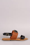 This flat sandal features double band across vamp, open toe silhouette, rhinestones design, and slingback construction with side buckle closure. Finished with a lightly padded insole for comfort.