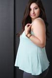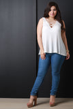 This top features a flowy knit fabrication, deep v-neckline with crisscrossing straps design, and sleeveless construction. Finished with a high low hemline. Accessories sold separately. Made in U.S.A. 96% Rayon, 4% Spandex.