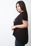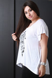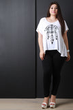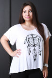 This plus size top features a jersey knit fabrication with an anchor and dreamcatcher graphic print, short sleeve construction, and high low hemline. Accessories sold separately. Made in U.S.A. 95% Rayon, 5% Spandex.