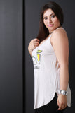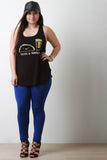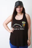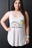 This plus size top features a smiling taco and tequila graphic print in front on a jersey knit fabrication, scoop neckline, sleeveless fit, and racerback. Finished with a rounded hemline. Accessories sold separately. Made in U.S.A. 97% Rayon, 3% Spandex.