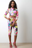 This top features a mock neckline, quarter-length sleeves, crop hemline, and a colorful abstract art pattern print. Accessories sold separately. Made in U.S.A. 95% Polyester, 5% Spandex.