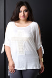 This plus size top features a jersey knit fabrication, crochet cross detail at front, boat neckline, cold shoulder with self-tie sash sleeves, and high-low hemline. Accessories sold separately. Made in U.S.A. 95% Polyester, 5% Spandex.