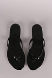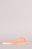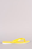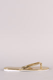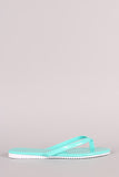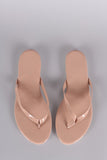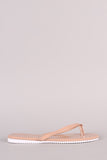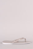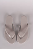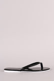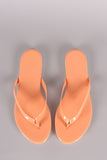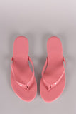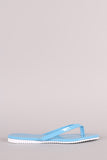 This casual flat sandal features a patent upper, thong construction, and easy slip-on design. Finished with a lightly padded insole.