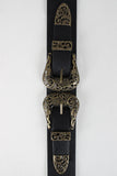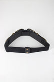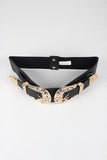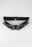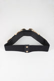 This stylish belt features a vegan leather, contrasting elastic band with double button snap closure, and double metallic buckles with etching and cutout details.