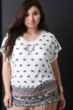 Elephant Print Keyhole-Back Side Pleated Blouse Top