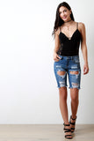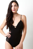 This chic bodysuit features a textured knit fabrication with contrasting side to back lace design, spaghetti straps, and plunging v-neckline. Finished with a double button snap closure at crotch, and breasts padding. Accessories sold separately. Made in U.S.A. Self: 90% Nylon, 10% Spandex. Contrast, 95% Polyester, 5% Spandex.