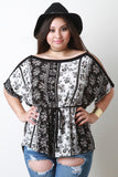 This cute plus size top features a cold shoulder design, boat neckline, spaghetti straps, woven fabrication, multi color floral print pattern, contrast trim and string tie belt, dolman half sleeve, boxy fit, with a rounded high low hem. Accessories sold separately. 100% Rayon.
