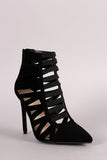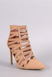 This gorgeous pump features a pointy toe silhouette, caged cutout design, elasticized straps across vamp, and wrapped stiletto heel. Finished with a rear zipper fastener and lightly cushioned insole.